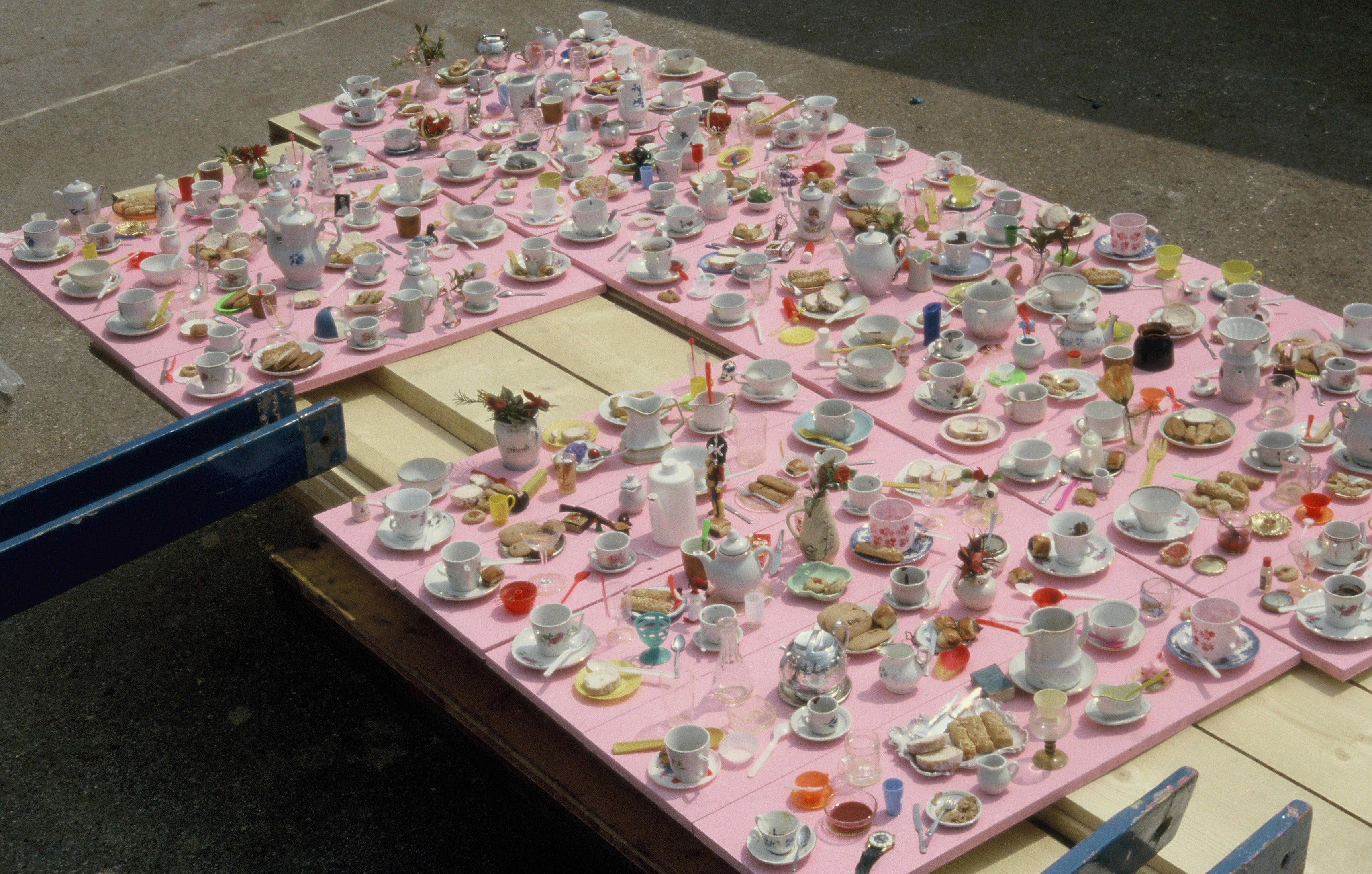 Spoerri covered the restroom at Luna Luna with a facade that resembles Classical architecture, in front of which he placed a pair of three-dimensional victory columns holding large piles of fake, steaming excrement. Inside the installation, empty teacups, half-finished bread and cookies, and dirty silverware covered the pink walls surrounding the toilets.