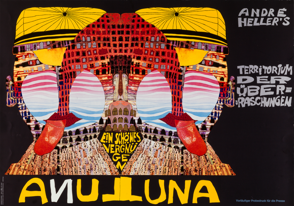 For Luna Luna, Hundertwasser created a collaged poster of a carnivalesque dreamscape depicting two faces with tongues sticking out of their mouths. With twin caps made from rising suns, eyes falling over crashing waves, and faces made from many-windowed city buildings, these two faces draw the viewer into André Heller’s “territory of surprises,” as a phrase on the poster reads.