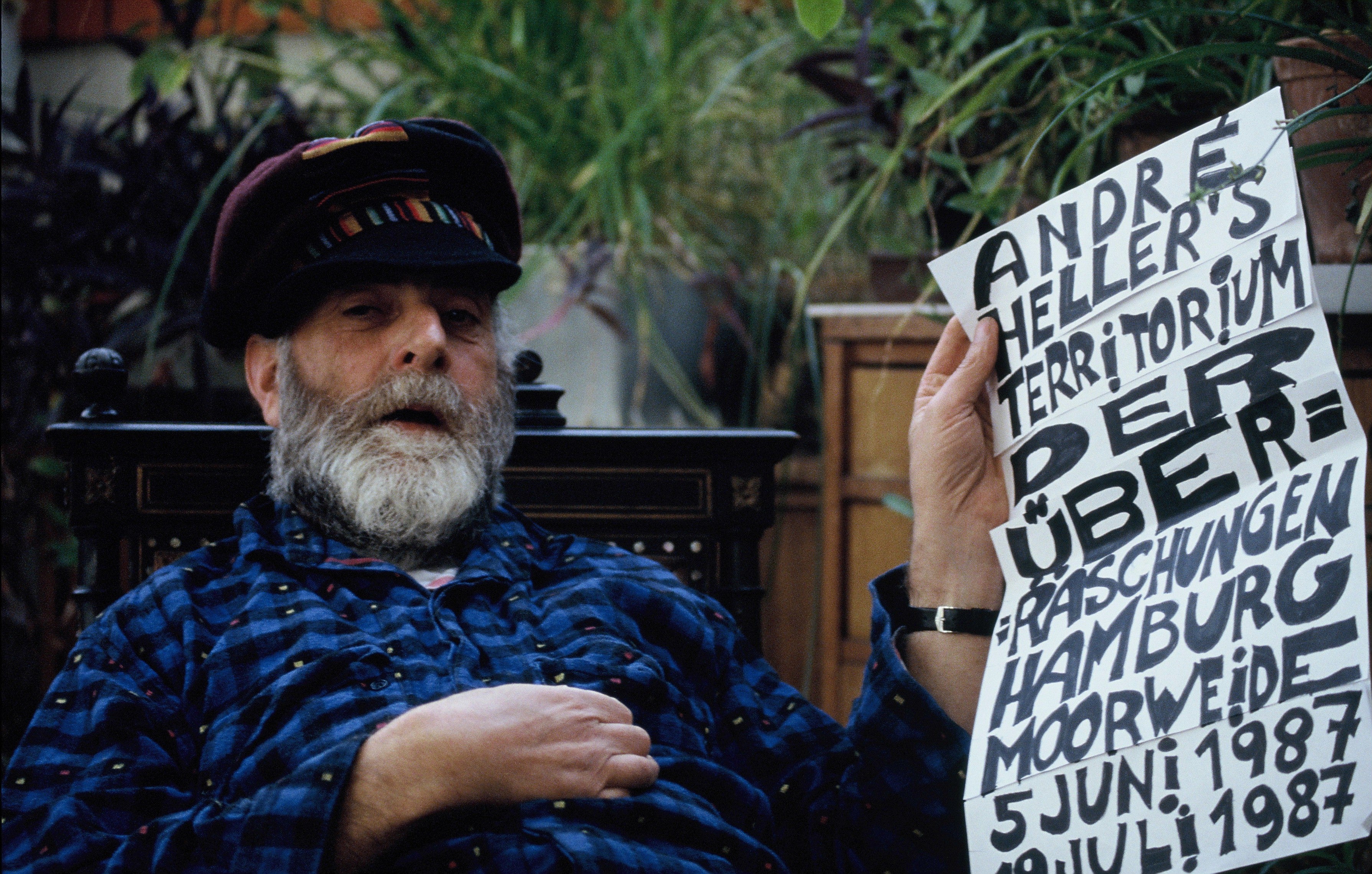 For Luna Luna, Hundertwasser created a collaged poster of a carnivalesque dreamscape depicting two faces with tongues sticking out of their mouths. With twin caps made from rising suns, eyes falling over crashing waves, and faces made from many-windowed city buildings, these two faces draw the viewer into André Heller’s “territory of surprises,” as a phrase on the poster reads.
