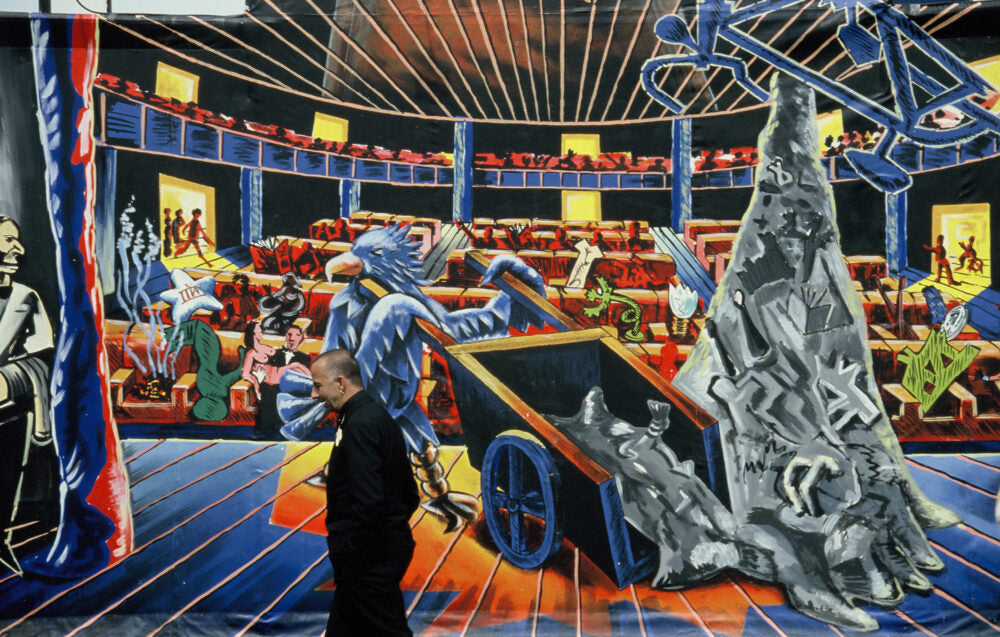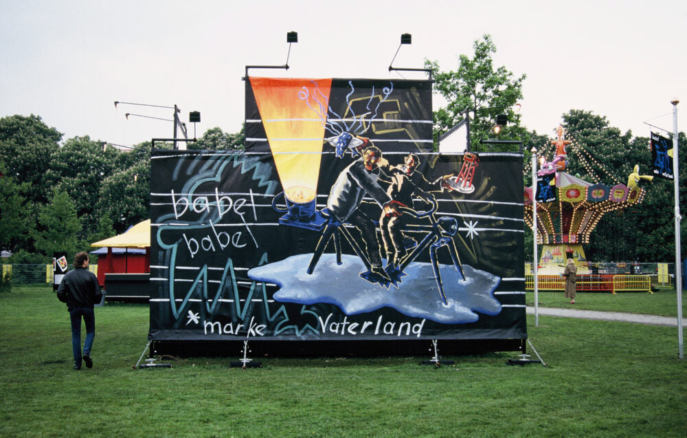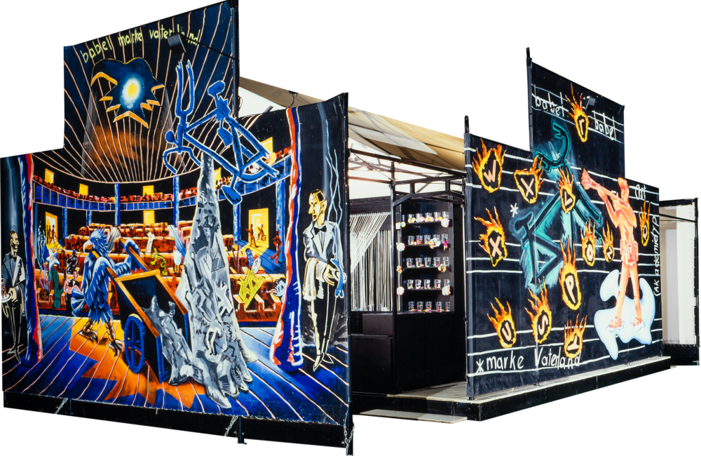 Immendorff created flags, a poster, and a shooting gallery outfitted with outsize, nightmarish depictions of Germany’s recent past. In one of the paintings, a Reichsadler, or German Imperial Eagle (a symbol of national pride tainted by Nazi usage), pushes a wheelbarrow full of pallid bodies onto a cabaret stage. Hovering over the near-empty theater, a sign gesturing to the emptiness of German national identity reads “babel marke vaterland,” or “babel brand fatherland,” above a destroyed bicycle. Inside, visitors shot at cups in an act of annihilation echoing the wreckage of postwar Germany.
