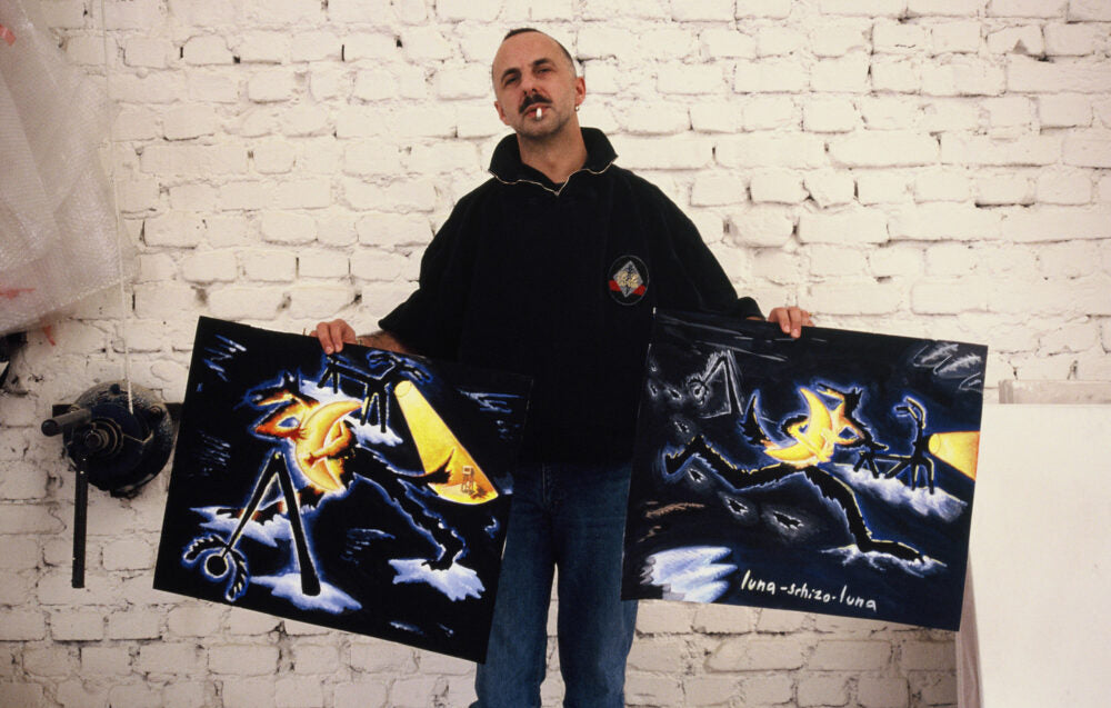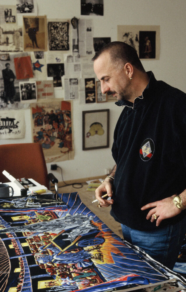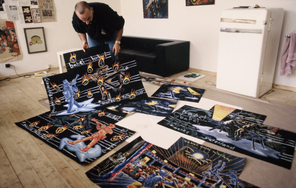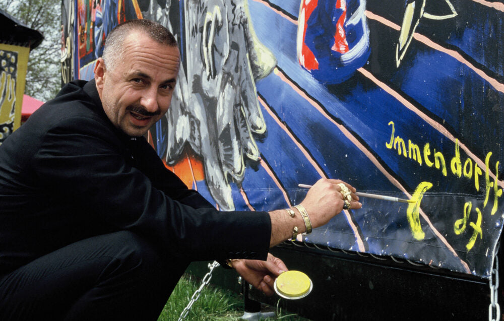 Immendorff began his renowned Café Deutschland series (1978-82) in the late 1970s: a series of 16 large-scale paintings influenced by Italian painter Renato Guttuso’s Caffè Greco (1976). Referencing the cabaret culture of prewar Berlin, these paintings use nightclubs as a staging ground for political and cultural scenes featuring figures as disparate as Adolf Hitler, Otto Dix, and Max Beckmann. Colorful, chaotic, and elaborately staged, they merge autobiography with social and political commentary to consider the division between East and West Germany in the decades following World War II. In addition to oil painting on canvas, Immendorff worked on stage sets and costumes for the Salzburg Festival and created a number of public sculptures.