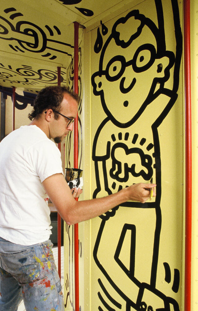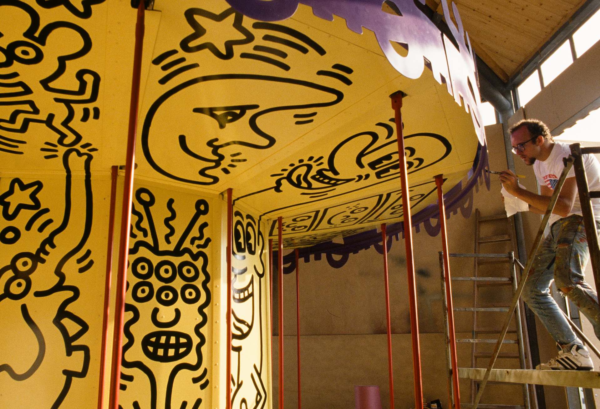 A self-portrait of Haring holding a paintbrush adorns two panels at the center of the carousel.
