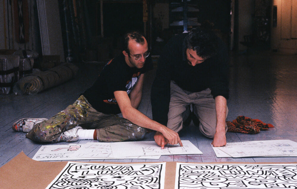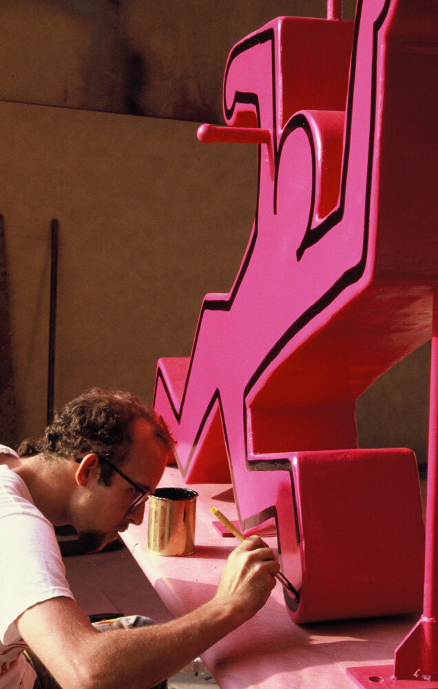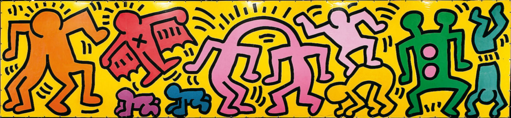 Keith Haring was a painter known for his instantly recognizable, pattern-like visual language. Uniting the bright colors of Pop Art, the whimsy of cartoons, and the deviousness of graffiti, Haring developed a distinct, iconic style marked by bold, black outlining. While studying at the School of Visual Arts in New York, Haring drew inspiration from outside the academy, making friends with legendary artists of the downtown arts scene, including Jean-Michel Basquiat and Andy Warhol. In 1980, while still a student, he began to draw on top of blank advertisements in subway stations across the city, creating trademark symbols such as the radiant baby, the dancing Everyman, or the barking dog—symbols that would become ubiquitous throughout the city and synonymous with his name.