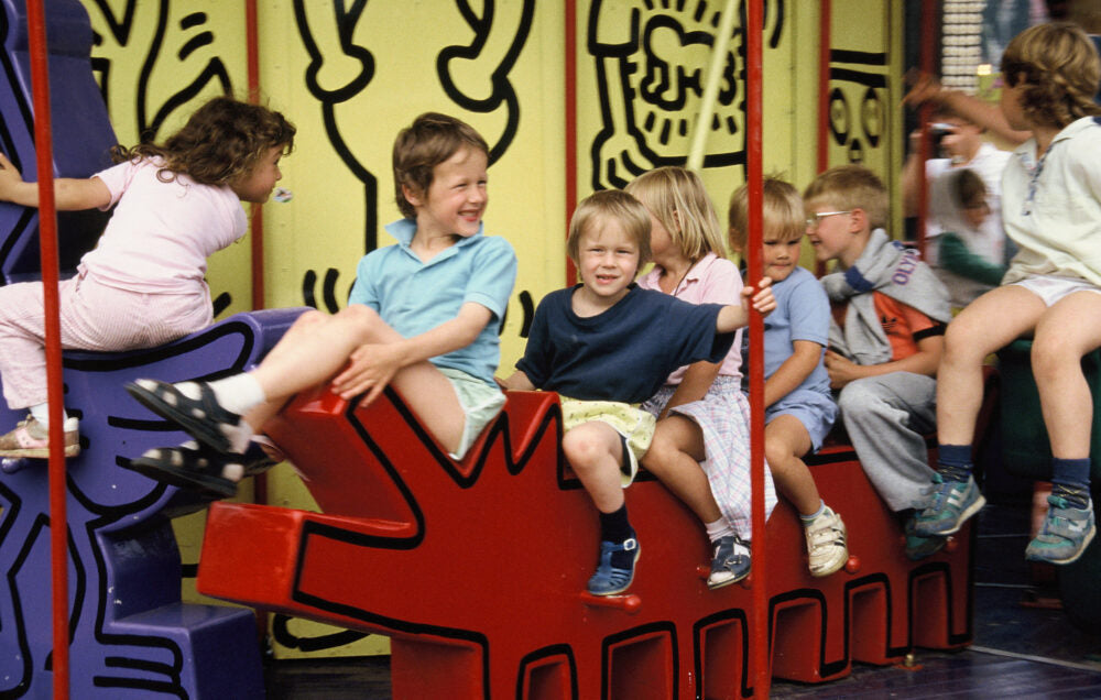 Haring designed a brightly colored carousel featuring three-dimensional versions of the characters from his iconic line drawings for the audience to ride. These characters also appeared on large tarps displayed throughout the park.