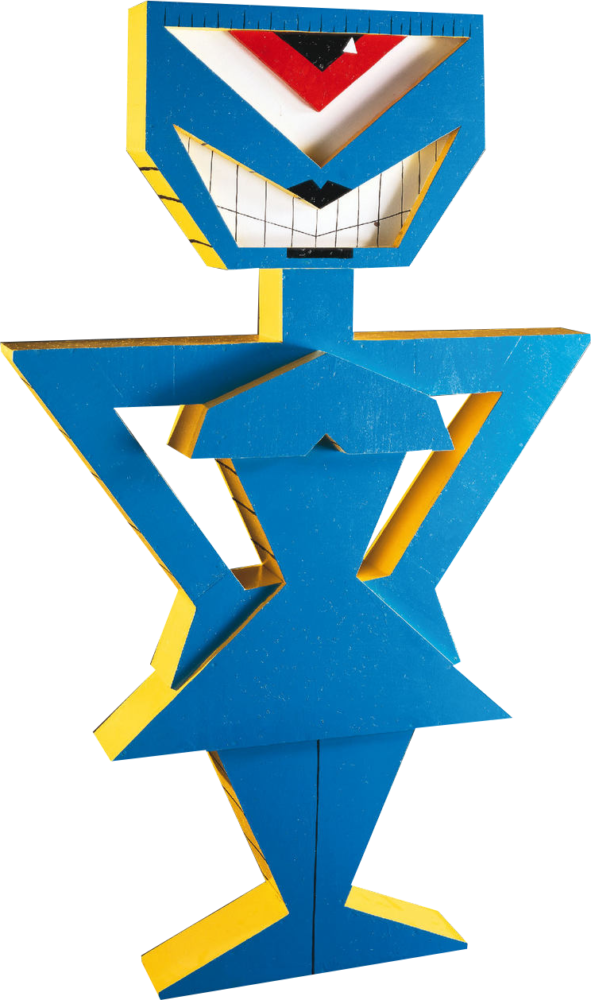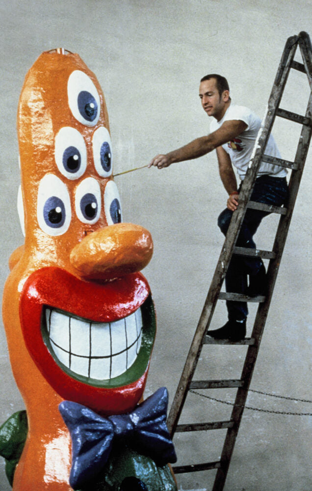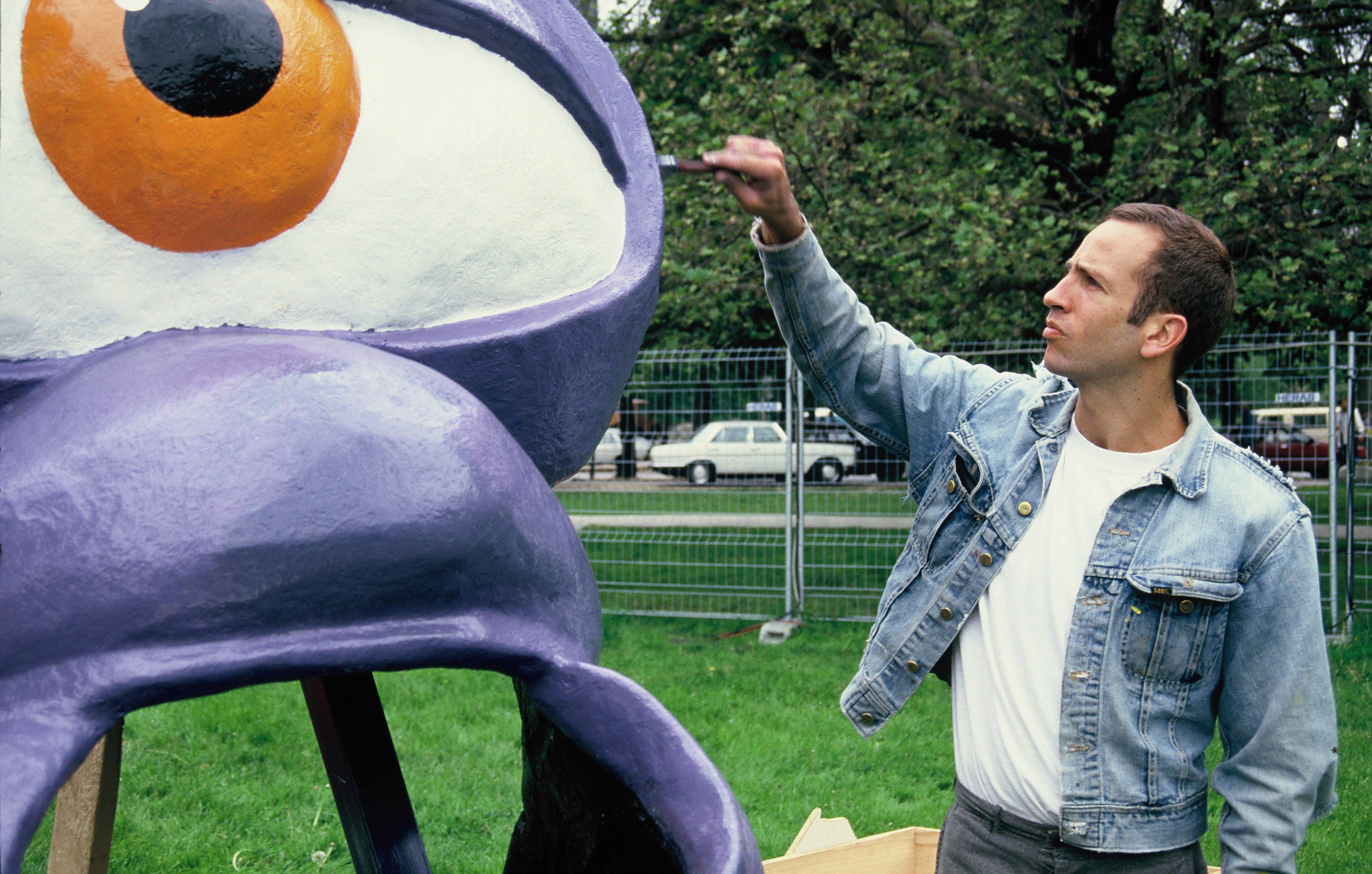 Influenced by growing up near Disneyland on a diet of cartoons and sitcoms, Scharf’s Luna Luna commission comprised a swing ride made up of panels graffitied with playful geometric shapes and his signature cartoon figures. Audience members were suspended from the rotating top of the ride, where they enjoyed views of the grounds and of Scharf's free-standing sculptures that beckoned visitors like carnival barkers.