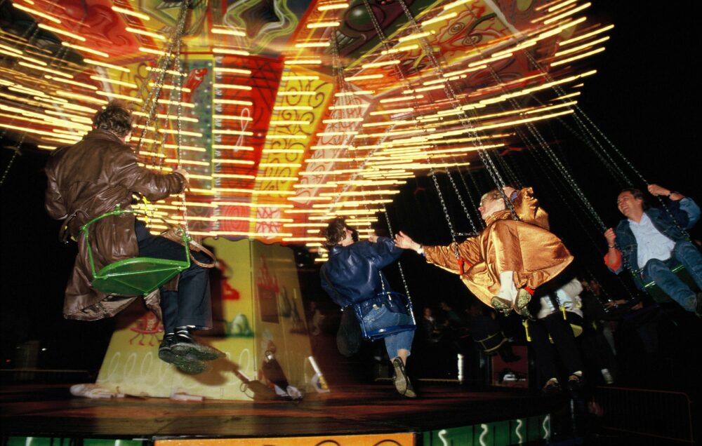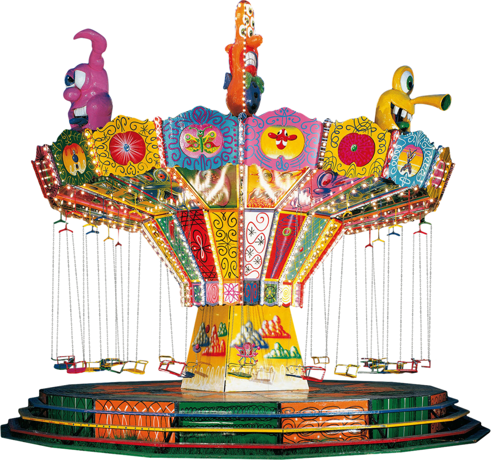 Fairground view: Kenny Scharf, Painted chair swing ride. Luna Luna, Hamburg, Germany, 1987.