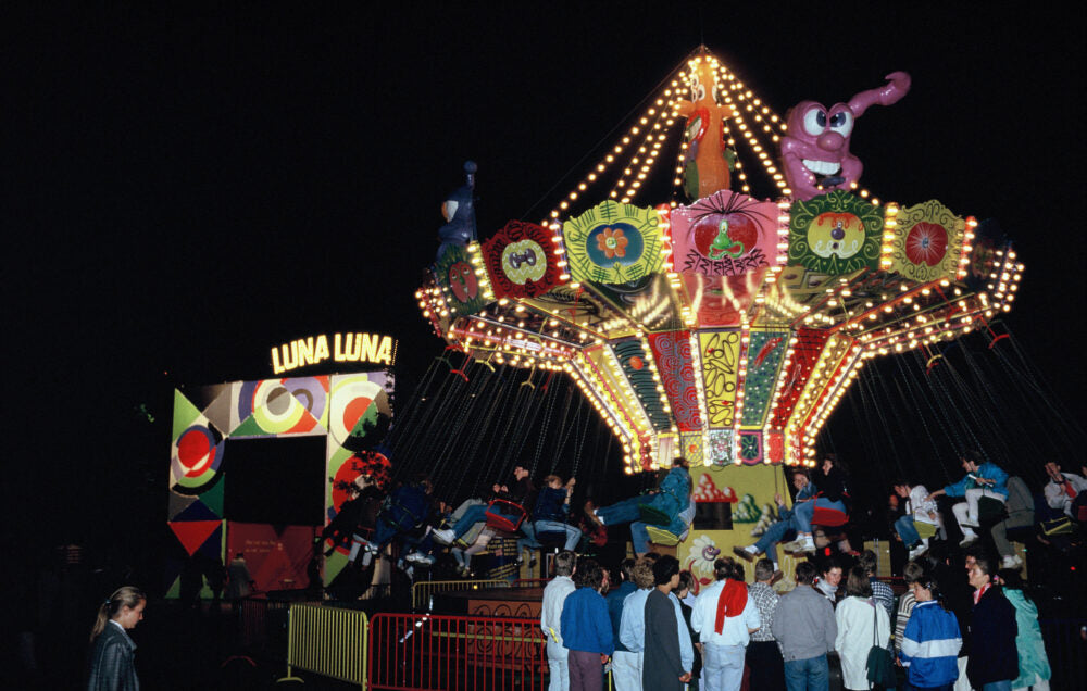 Scharf’s contribution to Luna Luna was a swing ride graffitied with playful geometric shapes and his signature cartoon figures.
