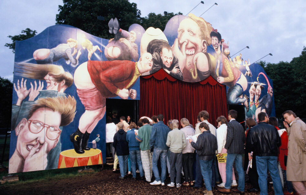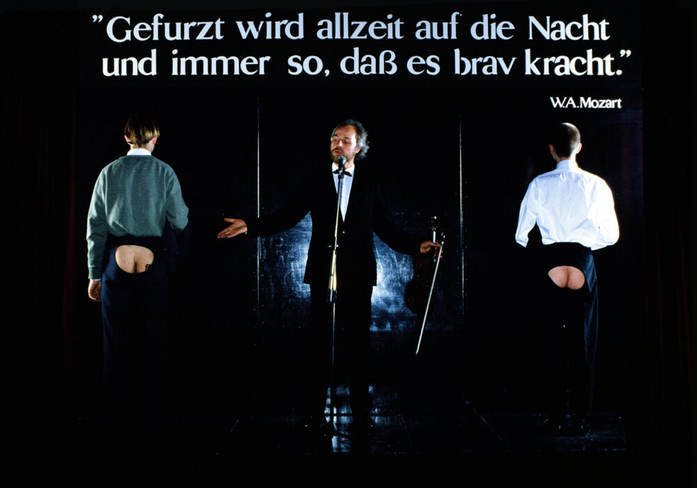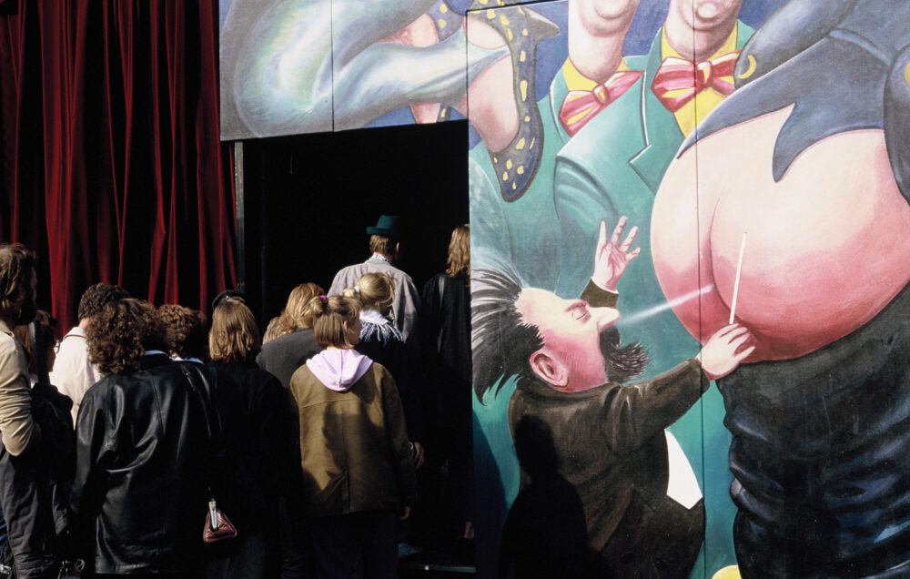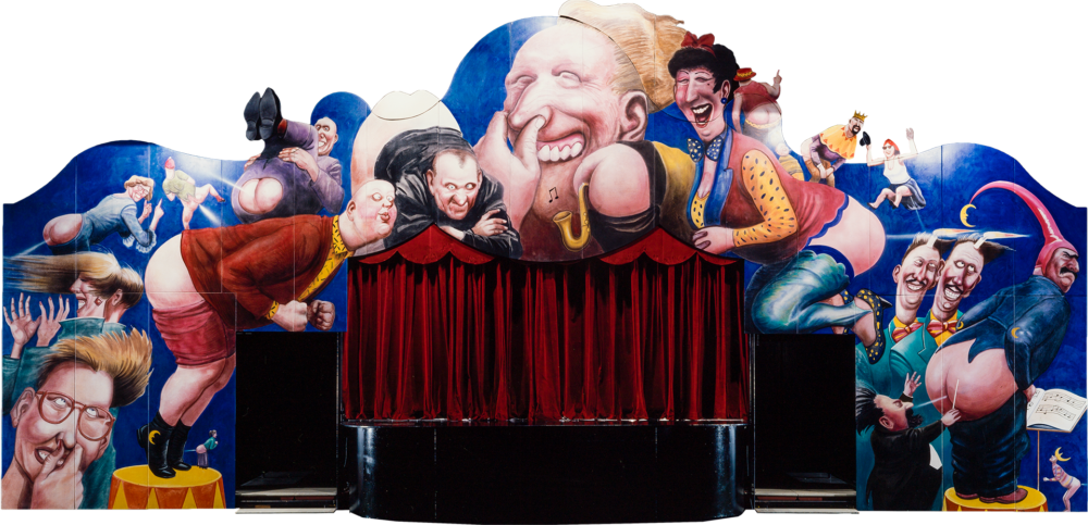 For Luna Luna, Deix designed a theatrical façade which used special performers farting into microphones accompanied by classical music.
