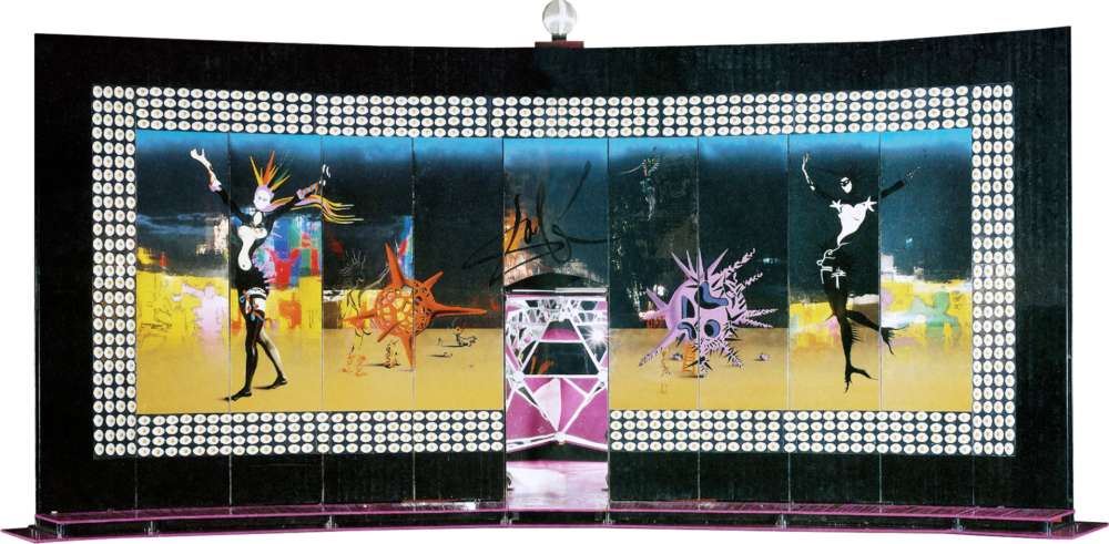 The exterior of the dome that Dalí designed for Luna Luna features a group of trapeze dancers intermingled with spheres covered in spikes, hovering in a nighttime landscape evocative of his native Catalonia. The inside of the dome features a mirrored, geodesic funhouse interior meant to induce spatial hallucinations.
