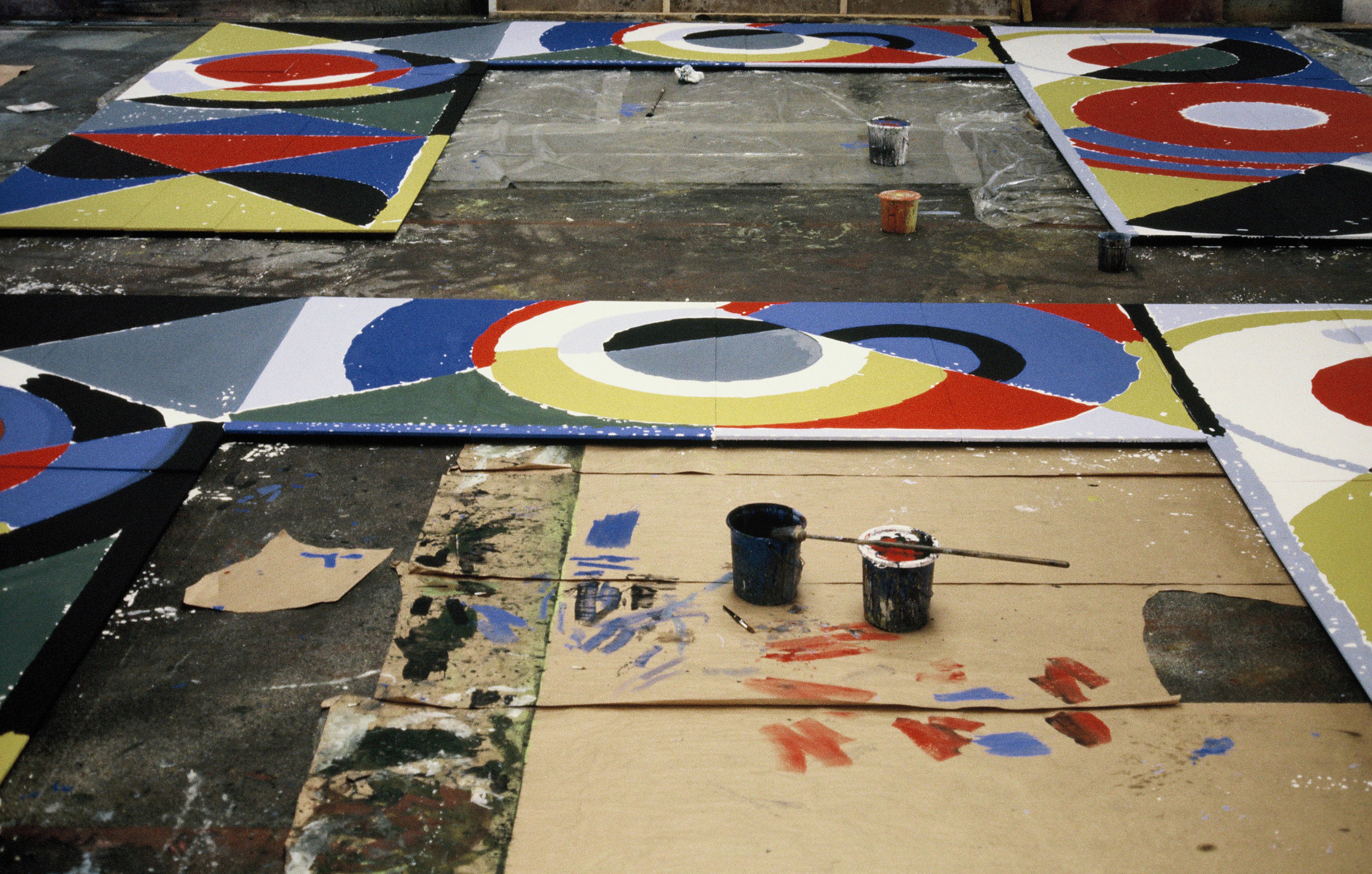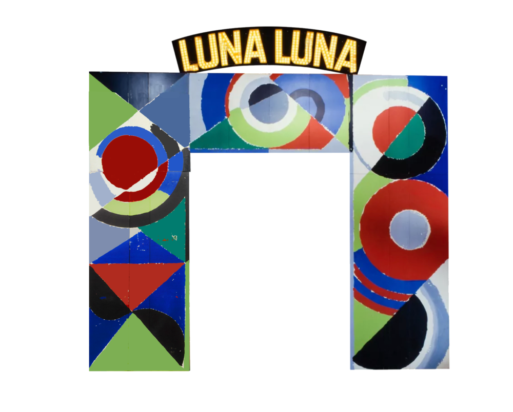 Delaunay envisioned her work for Luna Luna when she met André Heller before her death in 1979. Continuing her lifelong fascination with the intensity of contrasting colors, she designed an archway decorated with geometric shapes in bright hues of red, green, blue, black, and yellow to welcome visitors into the fairground.