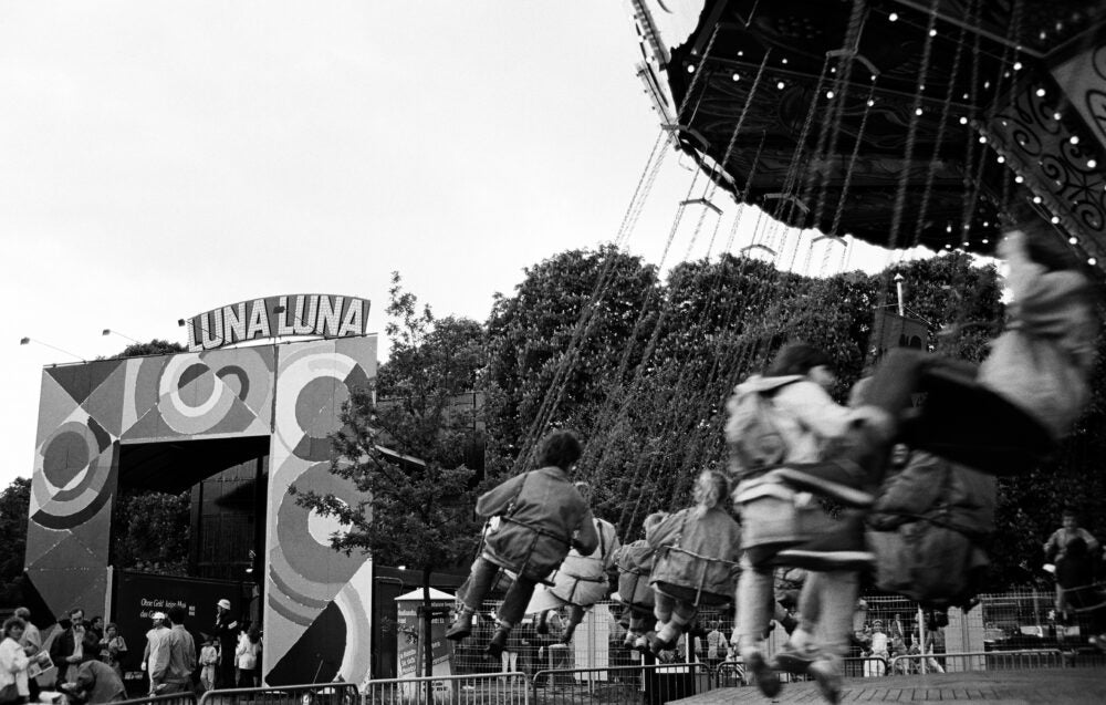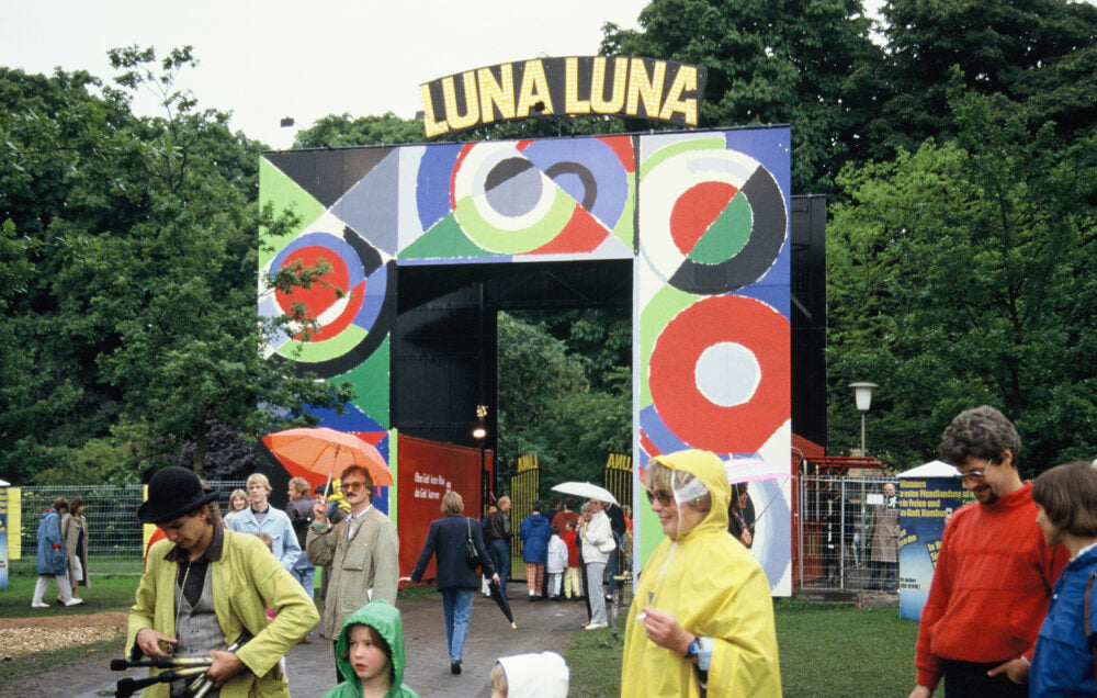 Fairground view: Sonia Delaunay, Entrance archway with Luna Luna sign. Luna Luna, Hamburg, Germany, 1987.