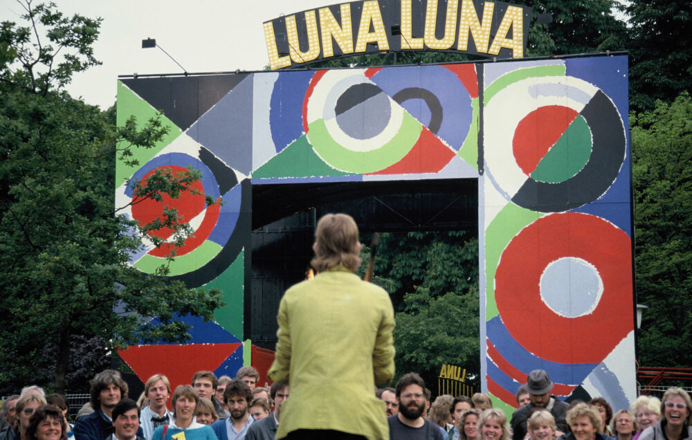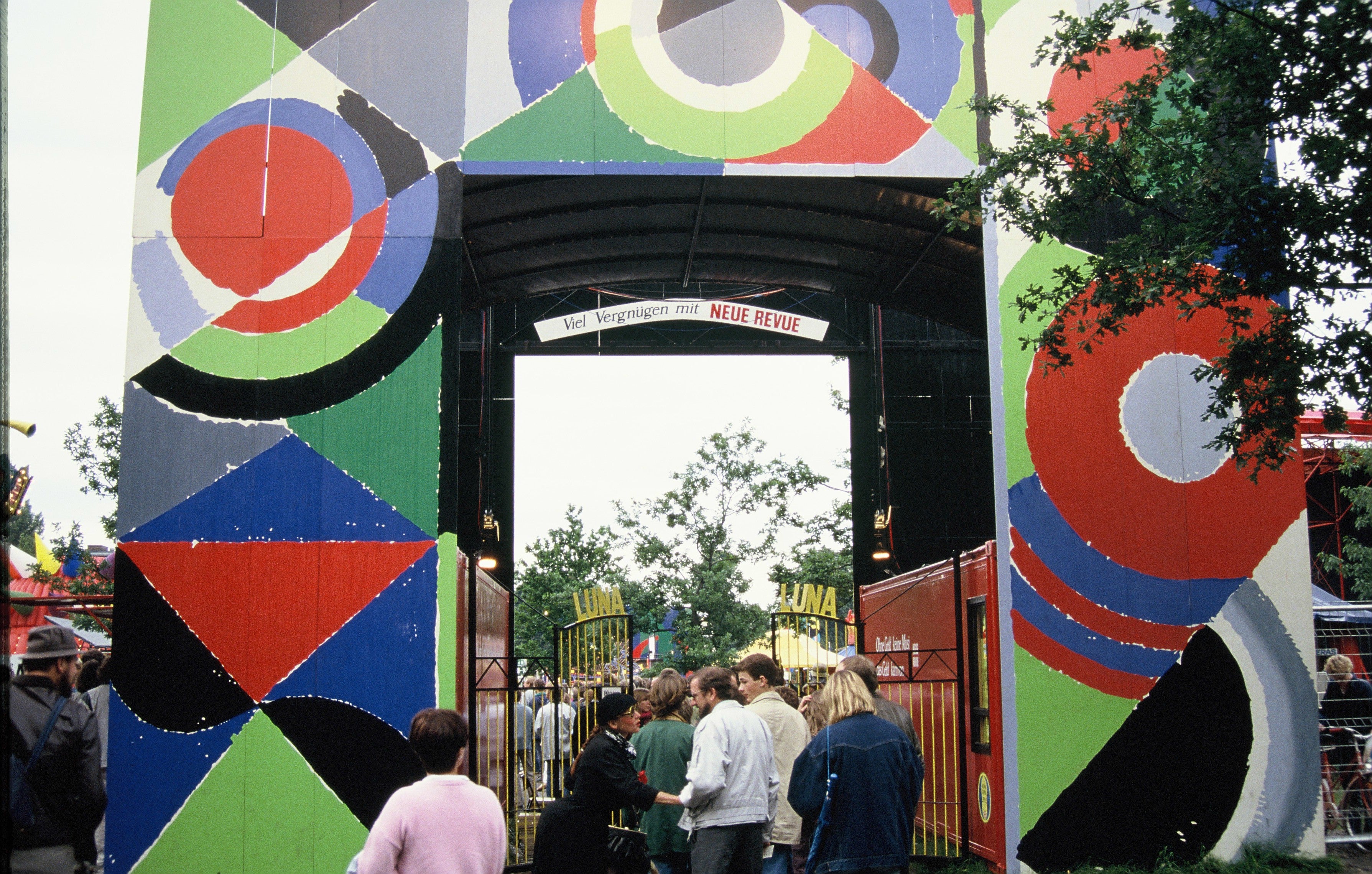 Delaunay envisioned her work for Luna Luna when she met André Heller before her death in 1979. Continuing her lifelong fascination with the intensity of contrasting colors, she designed an archway decorated with geometric shapes in bright hues of red, green, blue, black, and yellow to welcome visitors into the fairground.