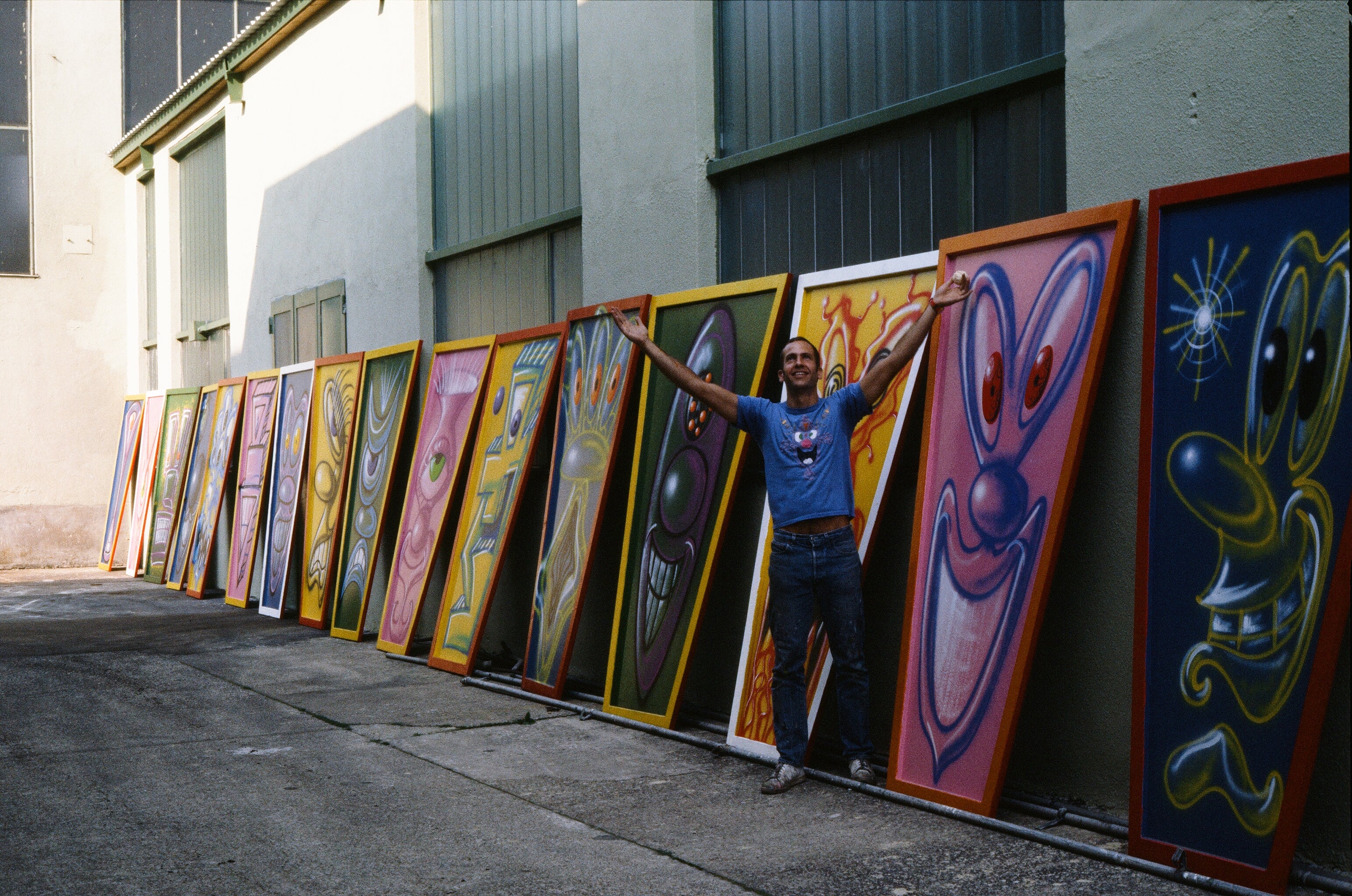 He employs a range of techniques and media to create hallucinatory worlds filled with cartoon characters and brightly-colored anthropomorphic blobs.